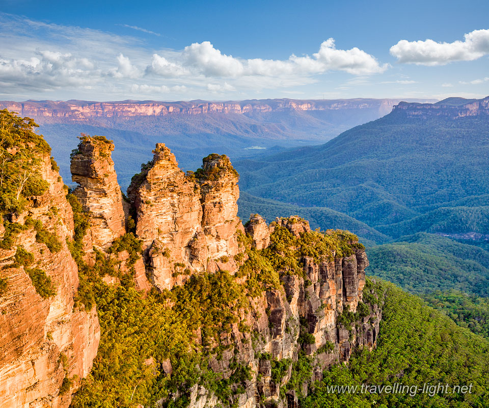 Three Sisters rock formation at Katoomba in the Blue Mountains of NSW, one of Australia's most famous tourist landmarks. Atmospheric haze is caused by the oil from the Eucalypt forest, hence the name Blue Mountains.