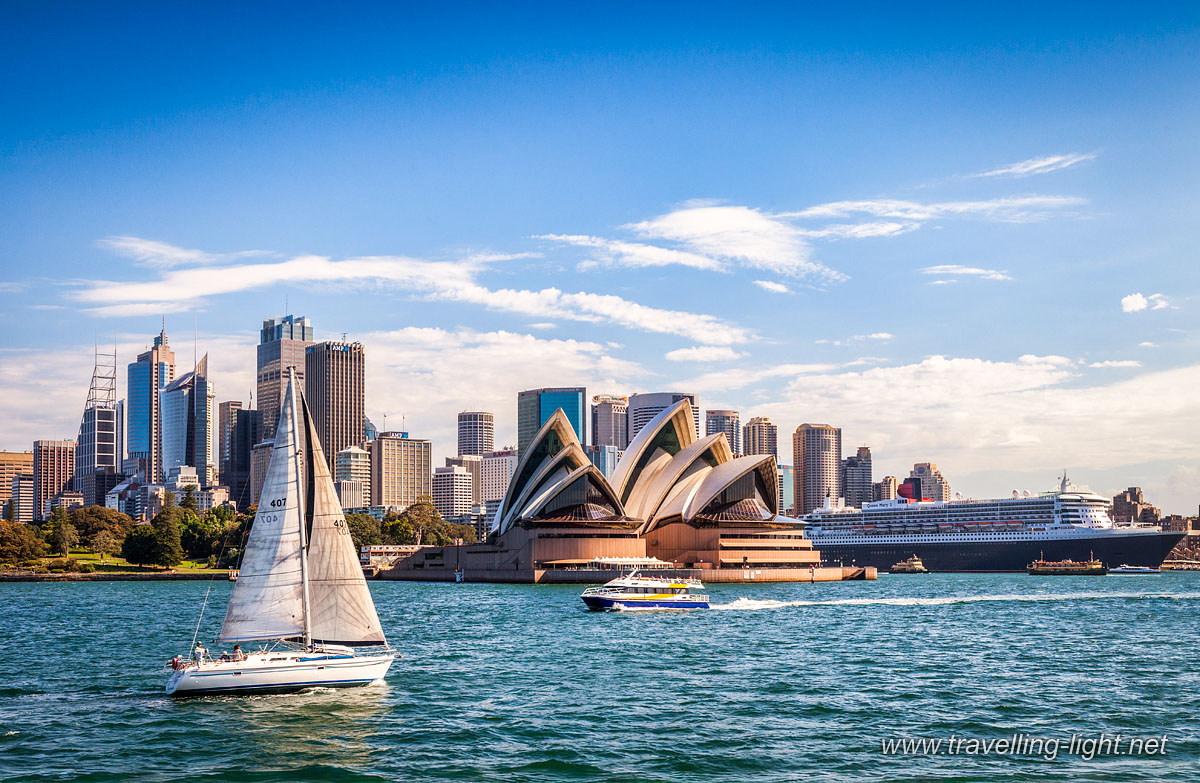 Sydney Harbour, Australia, with Sydney Opera House, a sailing boat, the CBD and Queen Mary 2 moored in Circular Quay.