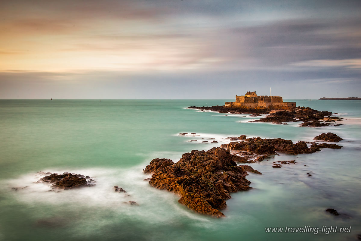 The Fort National, off Saint-Malo, Brittany, France, at sunset.